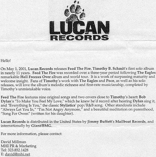 Feed The Fire, Timothy B. Schmit's first solo album in more than a decade, will come out on May 1. Released on Schmit's own Lucan Records and distributed through Jimmy Buffett's Mailboat Records in the U.S., the album came out April 2 in Europe through Giant/BMG. The album was produced primarily by Schmit, with four tracks produced by Mark Hudson.